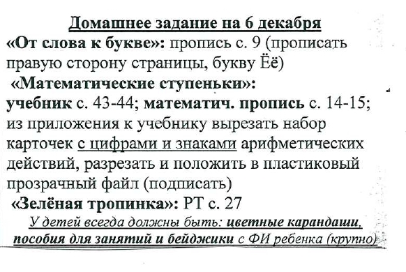 - «Математические ступеньки»: учебник с. 29; матем. пропись с.6-7 (доделать); из приложения вырезать набор предметных картинок, разрезать и положить в пластиковый прозрачный файл (подписать)